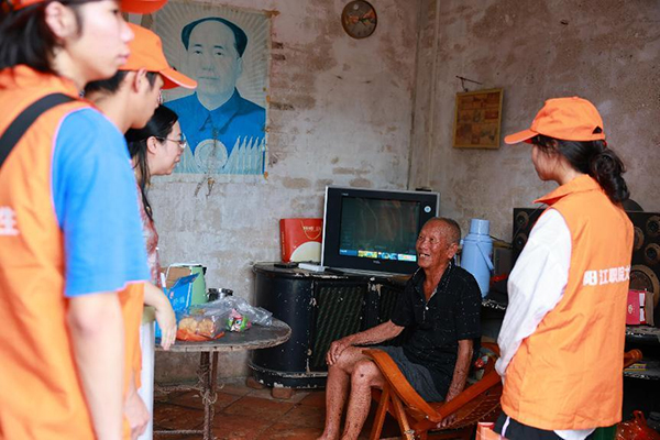 图为实践团成员到村民许伯家中听他讲述革命故事